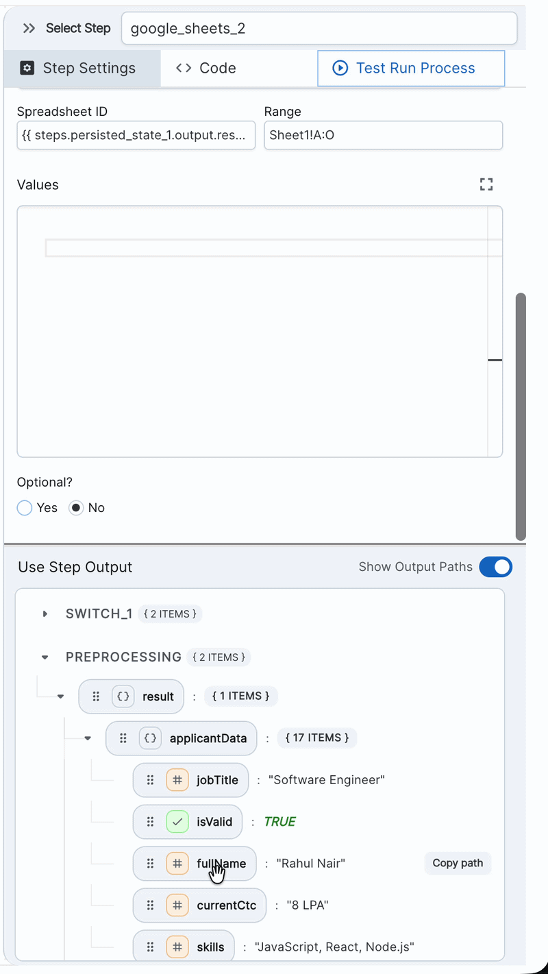 - In the right panel, scroll to Use Step Output and toggle on Show Output Paths.
